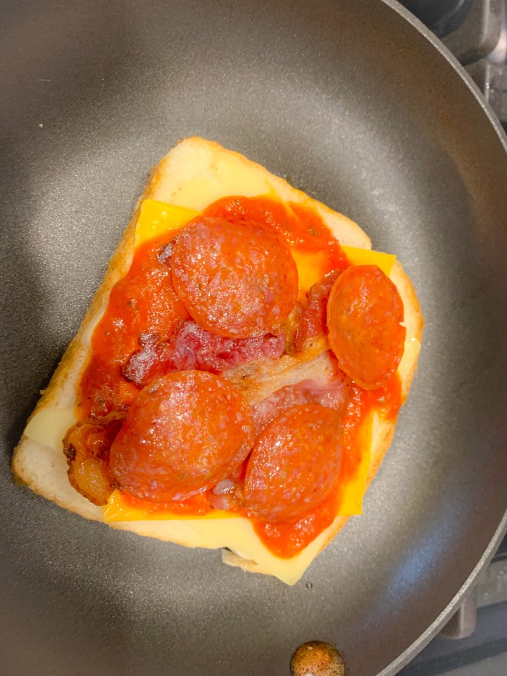 Set the grilled cheese up like you any other grilled cheese; butter the bread and add the cheese. Spread the pizza sauce evenly across the the top and just add the bacon then pepperoni. Place the top on and flip when ready. Let brown and enjoy