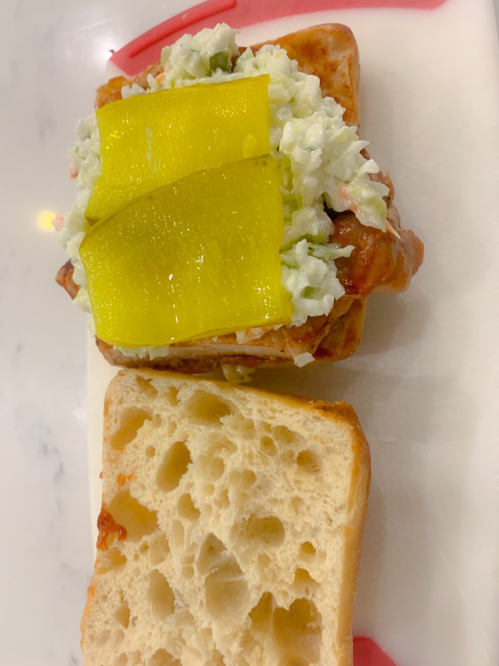 Now the fun part. Once everything is done take the bottom half of your bun and coat with BBQ sauce. I like to slice the porkchops up but you don’t have to, just add them to bun and if you want more BBQ sauce, this is the place to add it. Pile the coleslaw on and don’t be shy.