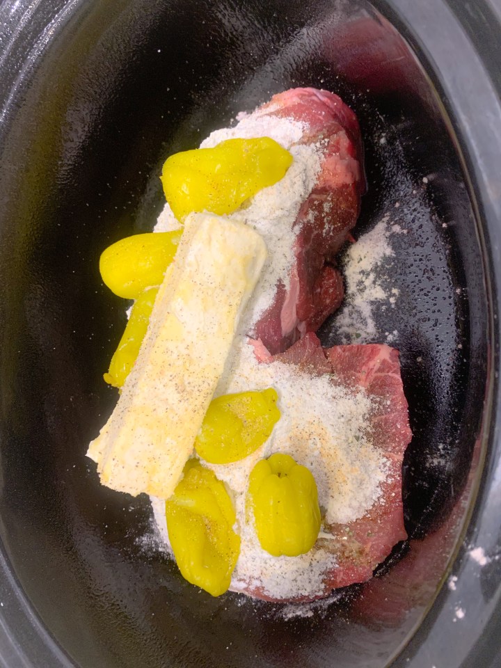 This one is really simple, first we pull out the crockpot and just stack all of the ingredients on top.